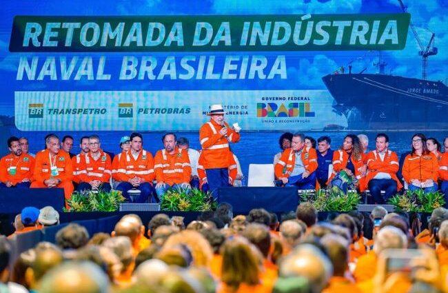 POSTOS DE TRABALHO — De acordo com o coordenador-geral da Frente Única dos Petroleiros, David Bacelar, são mais de 44 mil postos de trabalho que serão gerados pela indústria naval a partir das encomendas da Petrobras. “Nós estamos falando dos estaleiros que estarão em pleno funcionamento, hoje já, com obras e encomendas para o Rio Grande do Sul, para o Espírito Santo, para Santa Catarina, mas chegaremos à Bahia, a Pernambuco, aqui ao Rio de Janeiro. Então, temos motivos de sobra para nós estarmos aqui comemorando a retomada da indústria naval, que será feita a partir da força de trabalho de cada trabalhador e trabalhadora aqui presente”, declarou.