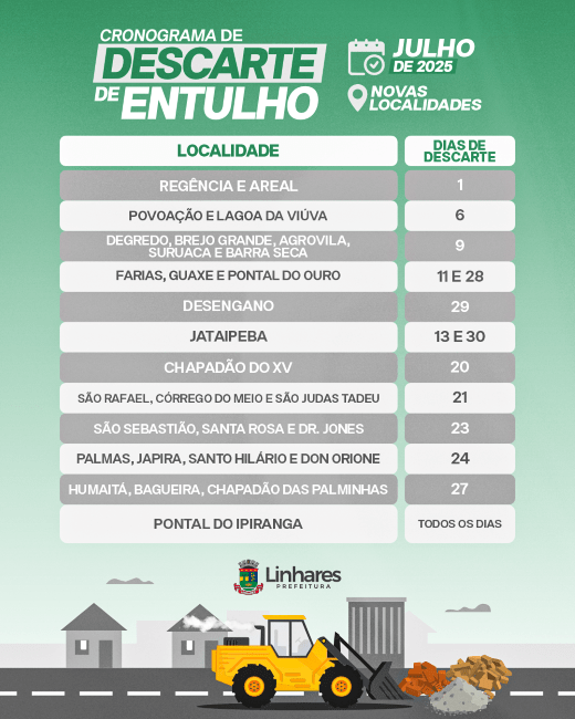 O município de Linhares (ES), por meio da secretaria municipal de Obras e Serviços Urbanos, divulgou nesta sexta-feira (27), o cronograma de descarte de entulho do mês de julho.