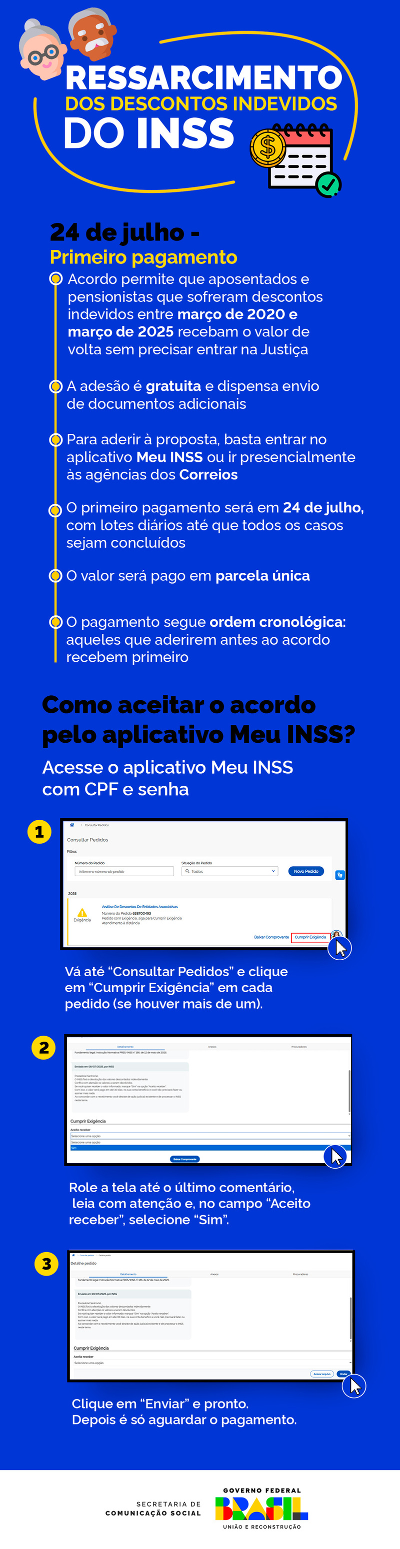 AÇÃO JUDICIAL — Se ainda não recebeu valores pela via judicial, o beneficiário pode optar pelo acordo administrativo. Quem entrou na Justiça para receber o ressarcimento deverá desistir da ação contra o INSS, que se compromete a pagar 5% de honorários advocatícios nas ações individuais propostas antes de 23 de abril de 2025.