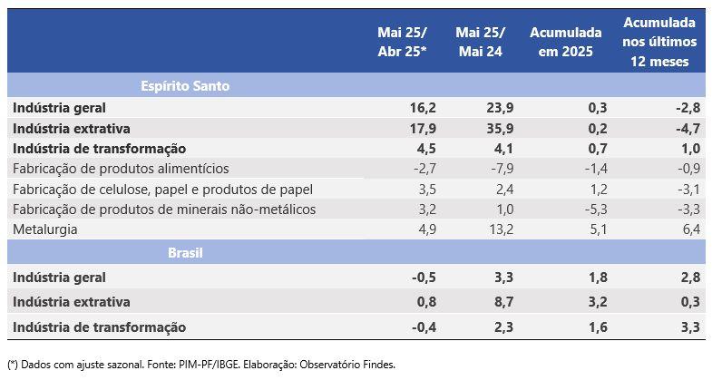 Também teve resultado positivo na indústria de transformação capixaba. Metalurgia (13,2%), fabricação de papel e celulose (2,4%) e a fabricação de produtos de minerais não metálico (1%) cresceram. Já a fabricação de produtos alimentícios contraiu 7,9%.