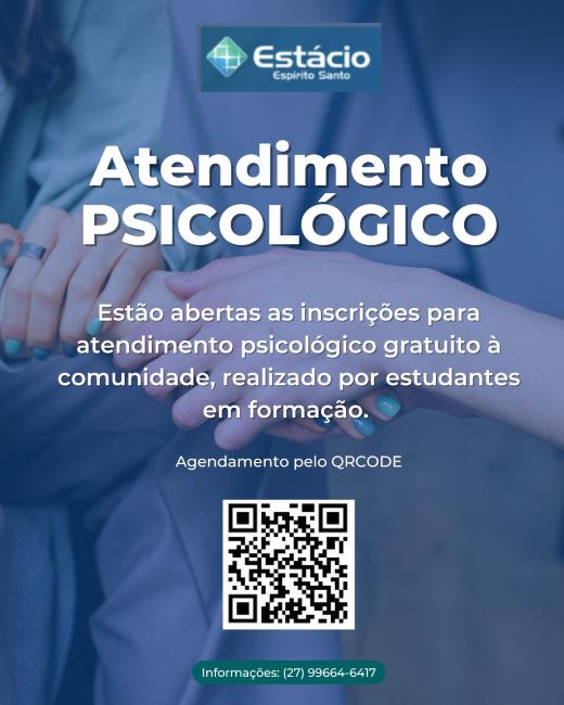 O Centro Universitário Estácio de Vitória (ES) está com inscrições abertas para atendimento psicológico gratuito à comunidade capixaba. Os encontros serão conduzidos por estudantes de Psicologia, sob supervisão docente, oferecendo apoio a pessoas que buscam acolhimento e escuta qualificada. Os agendamentos podem ser feitos diretamente pelo link https://forms.office.com/r/5KcJBV4DVP. Mais informações pelo telefone (27) 99664-6417.