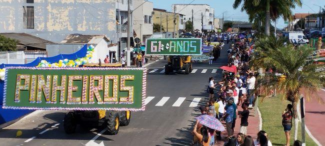 O desfile cívico de 07 de setembro, promovido pelo município de Pinheiros (ES), em alusão ao Dia da Independência do Brasil reuniu mais de mil pessoas no “Calçadão”, entre os bairros Domiciano e Vila Verde, na tarde deste domingo (7).