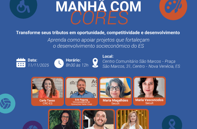 A programação do “Café com Cores – Nova Venécia” inclui palestras sobre Gestão Tributária, Leis de Incentivo à Cultura, Normas e procedimentos da LICC, além da apresentação de cases e momento para perguntas.